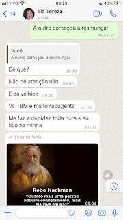Aparecida me contou que minha tia Mercedes mandou msg questionando ela .. o comentário em uma foto minha do almoço tenebroso aquele dia .. é mole ??? Graças a Deus que aparecida sabe lidar com ela e gosta muito de minha tia .. aí releva ela ! Minha tia Mercedes é muito difícil !!!!! Tava conversando com ela sobre as lamúrias e difícil convivência! Ela disse q vai tentar achar um homem p minha tia